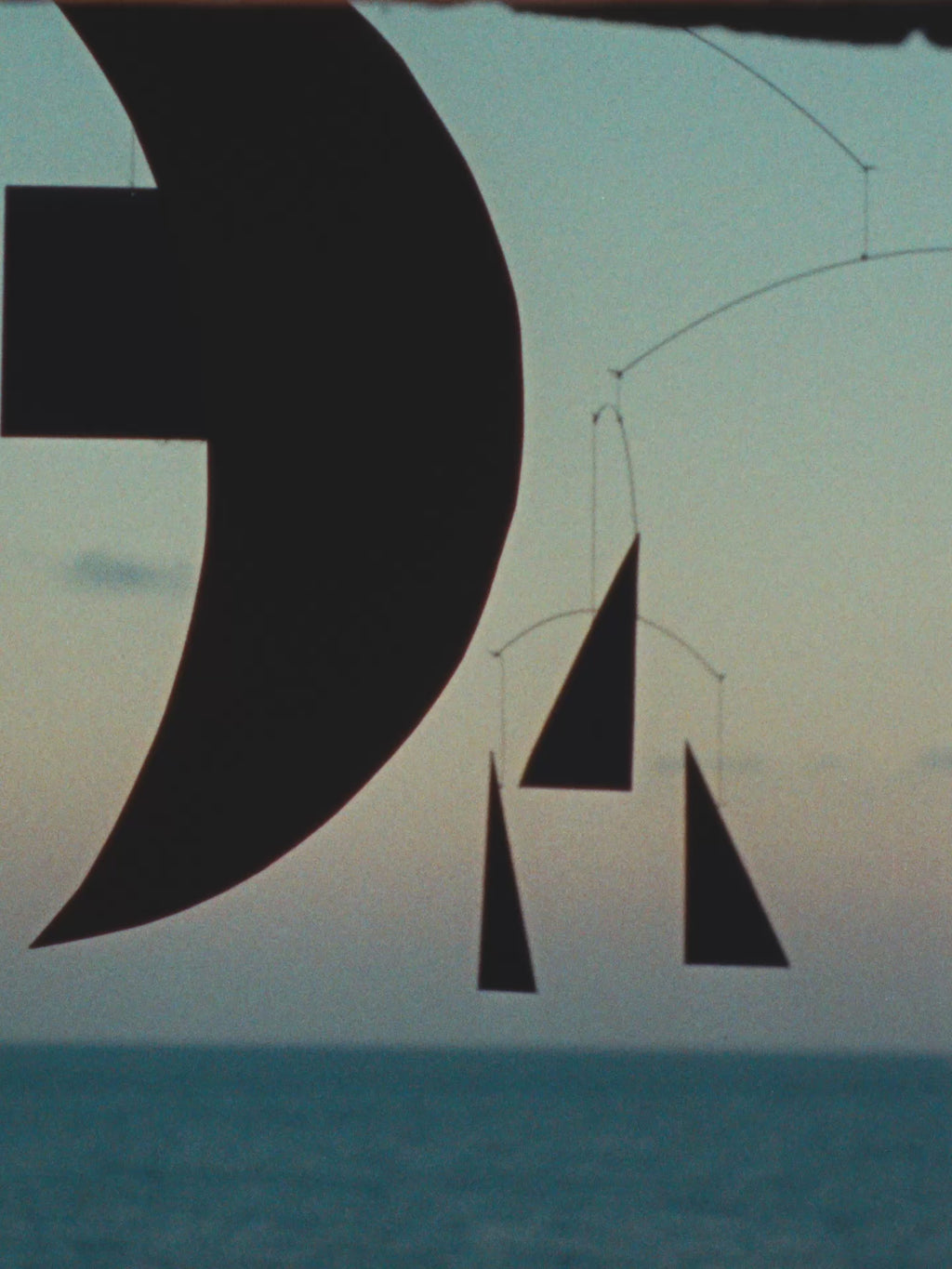 Med en progression fra smalle trekanter til brede trekanter, der kulminerer i en firkant og krones af en gylden ‘måne’, skaber uroen en poetisk balance mellem geometri og bevægelse. Ophængt i sarte strenge og tråde bevæger elementerne sig blødt i vinden og skaber skiftende kompositioner, der både er meditative og dynamiske.